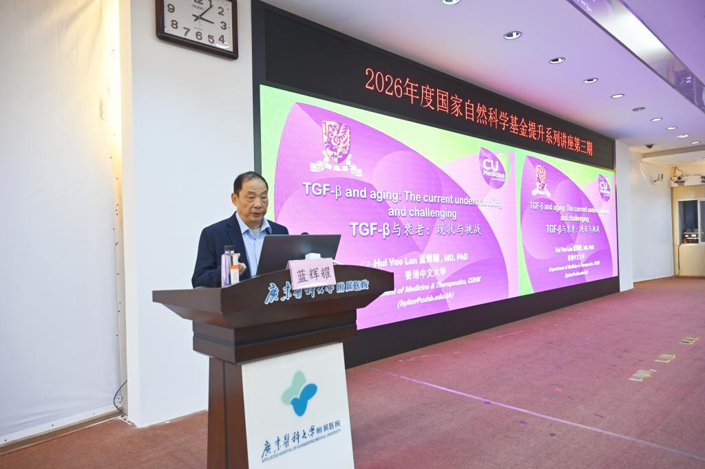 12月2日,广东医科大学附属医院科研部于行政楼一楼学术报告厅举办了2026年度国家自然科学基金提升系列讲座(第三期)。此次会议特邀香港中文大学蓝辉耀教授进行现场指导,其目的在于提升科室临床医生与科研人员的申报能力,提高申报书质量,为申报工作奠定坚实基础。会议由科研部部长马晓瑭主持,约300人参与了此次会议,其中包括本院2026国基金青年重点培育人员、2026国基金拟申报人员、博士、临床医生、研究生以及院内其他对此感兴趣的人员。