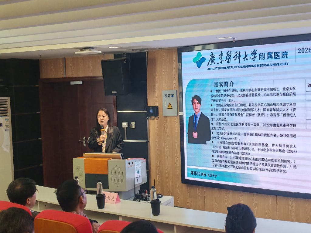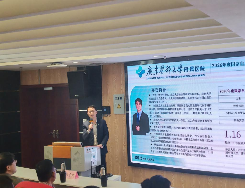 在医院建院56周年来临之际,为切实提升我院国家自然科学基金项目申报质量,向医院发展献礼,1月16日,科研部组织“2026年度国家自然科学基金提升系列讲座(第五期)”在全科楼二楼多功能报告厅顺利举行。本次讲座以“代谢与心脑血管疾病研究”为主题,特邀北京大学郑乐民教授担任主讲嘉宾。院领导、2026年度国基金青年重点培育人员、拟申报人员、博士、临床医生、研究生及院内科研骨干共计100余人参加。讲座由科研部部长马晓瑭主持,杨宇副院长致欢迎辞。