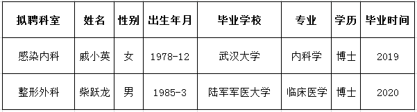 根据我院业务发展需要,按照公开、公平、公正的原则,对符合引进条件的人员进行了相关考核。经医院院长办公会、党委会讨论,拟对引进的博士予以公示。公示期:2022年4月28日至2022年5月4日止,公示7天。如有异议,请在公示期间向医院纪检监察室或高层次人才办公室书面反应情况。