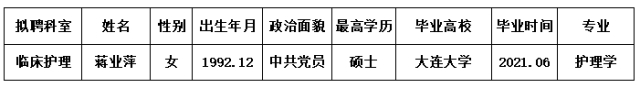 根据我院业务发展需要,按照公开、公平、公正的招聘原则,对符合应聘条件的人员进行了相关考核。经医院院长办公会和党委会研究,拟对下例人员予以聘用,现予公示。公示时间自2022年1月21日下午17时起至2022年1月28日下午17时止。如对招聘程序、拟聘用人员等有异议,请在公示期间向纪检监察室或人力资源部书面反应情况。