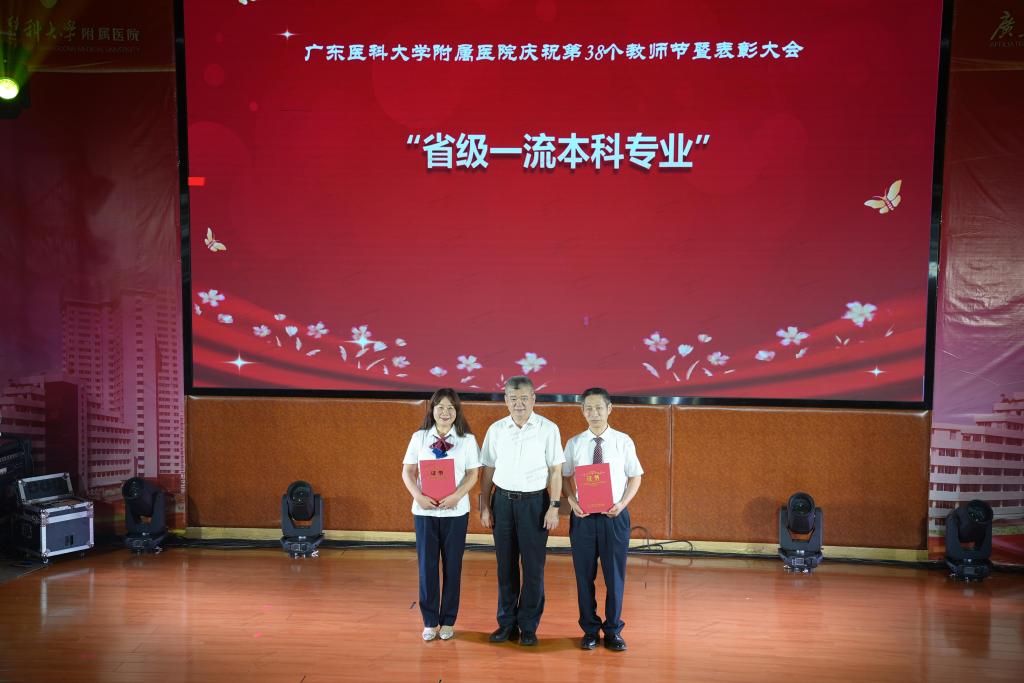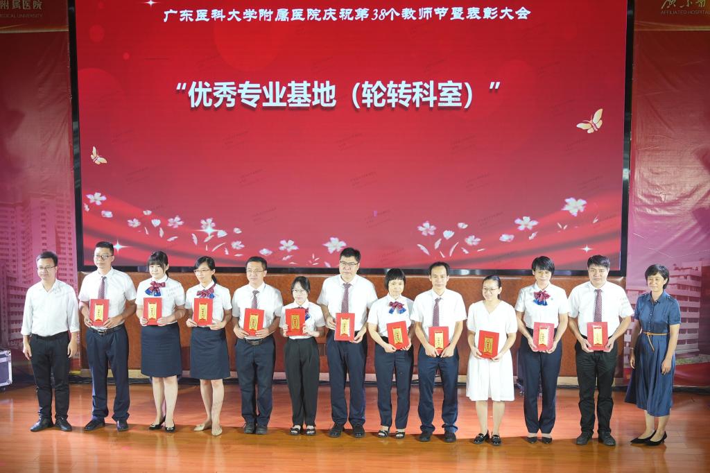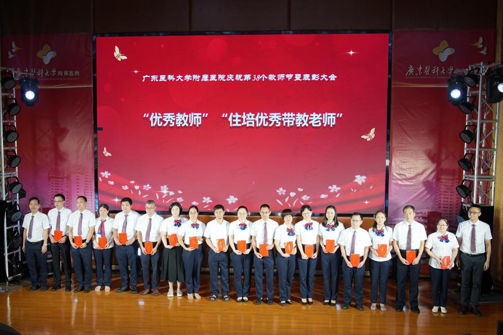 为营造尊师重教的氛围,弘扬崇高师德,9月8日晚,医院广东医附属医院举行以“迎接党的二十大,培根铸魂育新人”为主题的庆祝第38个教师节暨表彰大会,向辛勤耕耘在各个岗位上的全体教职员工送上节日的祝贺。党委副书记罗辉,教务处副处长王瑾,人事处副处长岑伟强,党委宣传部副部长冯锦山,第一临床医学院党委书记谭秋浩、副院长王志刚、佟琳,研究生院副院长彭浩晟等领导出席会议,医院领导班子成员、临床科室、行政职能部门负责人,退休教师代表、获奖代表、教师代表等参加会议。第一临床医学院院长、附属医院副院长张良清主持会议。