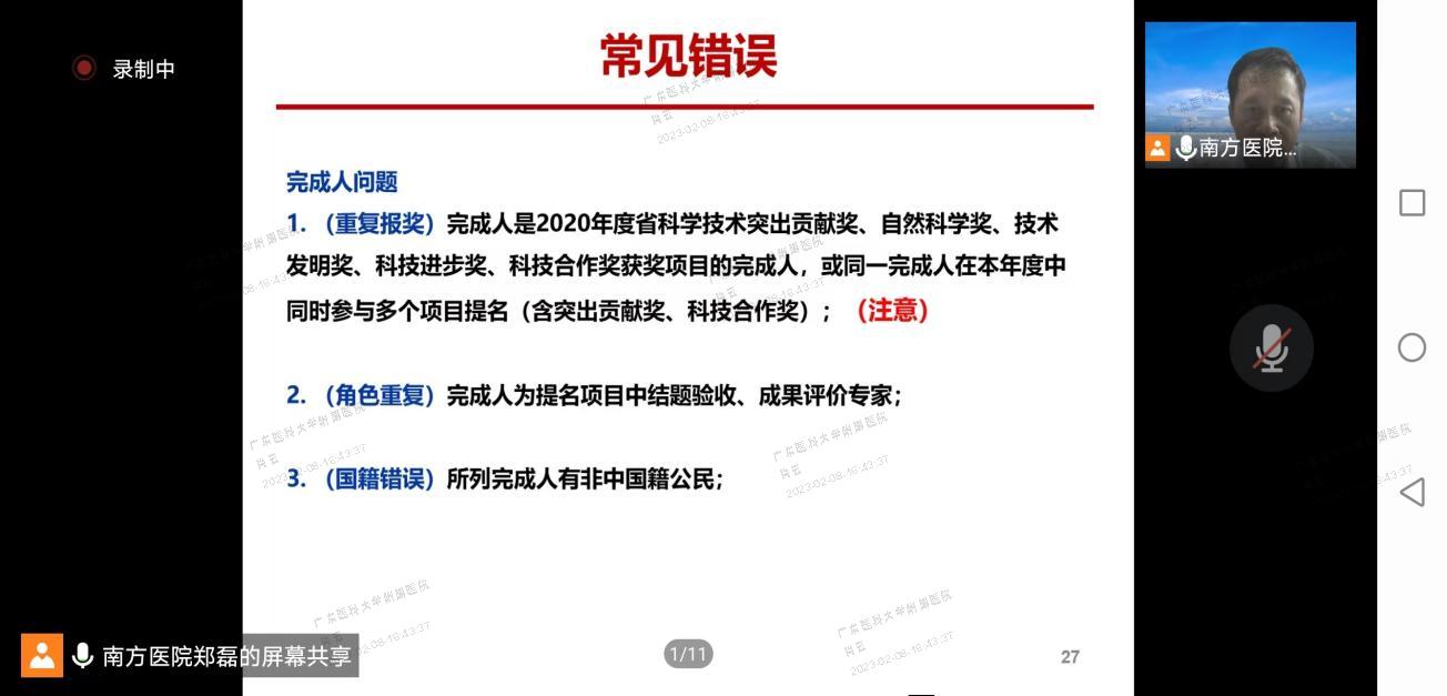 5月7日下午,科研部邀请南方医院郑磊教授进行成果奖申报线上培训会,75人参加培训会。郑磊教授拥有国家杰出青年基金获得者、广东省医学领军人才、国际细胞外囊泡学会(ISEV)教育委员会执行主席等一系列荣誉头衔,获得广东省科技进步一等奖1项、广东省教学成果一等奖2项,在成果申报方面拥有丰富的经验。郑磊教授结合自己申报广东省科技进步一等奖的项目和经验,从申报书撰写、申报通知要求、项目主要技术创新、申报附件、推广应用、时间安排及申报过程中常见错误进行详细介绍,并针对参会人员提问的问题进行细致解答。