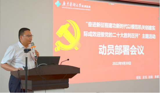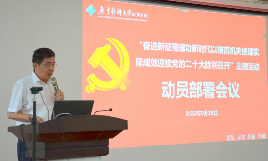 为了深入学习贯彻习近平总书记在省部级主要领导干部专题研讨班上的重要讲话精神,认真学习贯彻习近平总书记对广东系列重要讲话和重要指示批示精神,根据湛江市直工委文件要求,9月30日下午,广东医科大学附属医院于行政综合楼一楼学术报告厅召开“奋进新征程建功新时代以模范机关创建实际成效迎接党的二十大胜利召开”主题活动动员部署大会,推进模范机关创建走深走实,以实际行动迎接党的二十大胜利召开。医院领导、党委委员、纪委委员、职能部门负责人、临床医技科室负责人、教研室和研究所(室)负责人、各护理单元护士长、党支部书记参加会议。