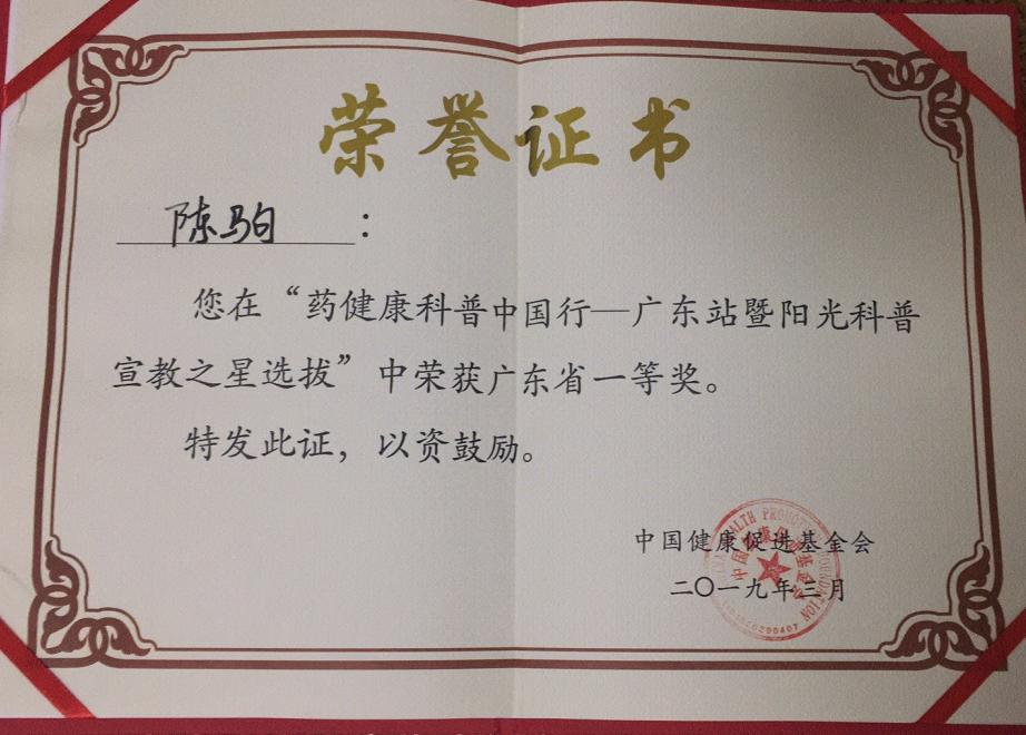 青年药师陈驹获“药健康科普中国行—广东站”暨阳光科普宣教之星选拔赛一等奖