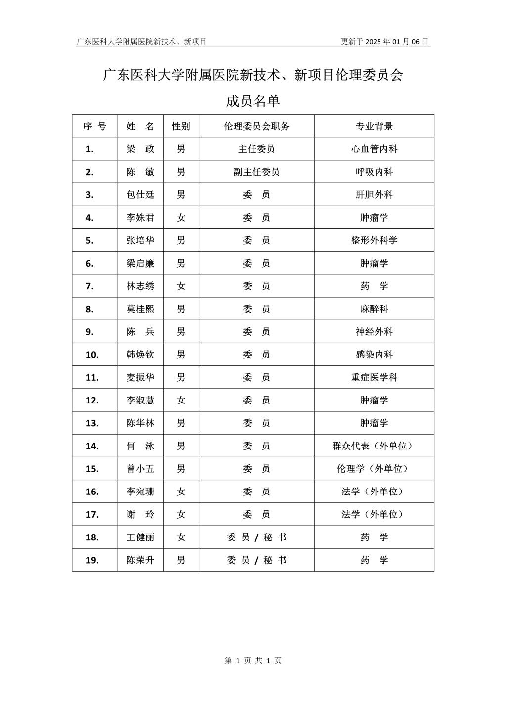 新技术、新项目伦理委员会名单(文件编号:广东医附政发[2025]1号,日期:2025-01-06)
