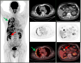 男,56岁,CEA: 40.5ng/ml,图A:肝脏多发转移瘤(红色箭头),图B:显示结肠肝曲高代谢肿块(绿色箭头),经肠镜证实为结肠腺癌。