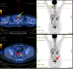 双癌检出:通过PET/CT一站式检查,同时检出两种肿瘤:甲状腺癌(绿色箭头)及子宫内膜癌(红色箭头),有利于临床治疗方案选择。
