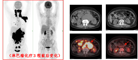 淋巴瘤治疗前后变化: 弥漫性大B细胞淋巴瘤化疗3程后,腹腔及腹膜后多发肿大淋巴结明显缩小,糖代谢明显减低。