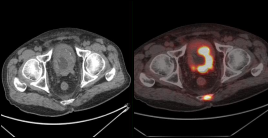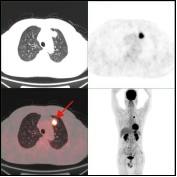 肺癌放疗前确定生物靶区:左肺下叶鳞癌患者(右图所示),左下肺癌病灶并远端阻塞性肺不张,PET/CT可以准确区分肿瘤组织与非肿瘤组织,确定肿瘤病灶生物靶区。